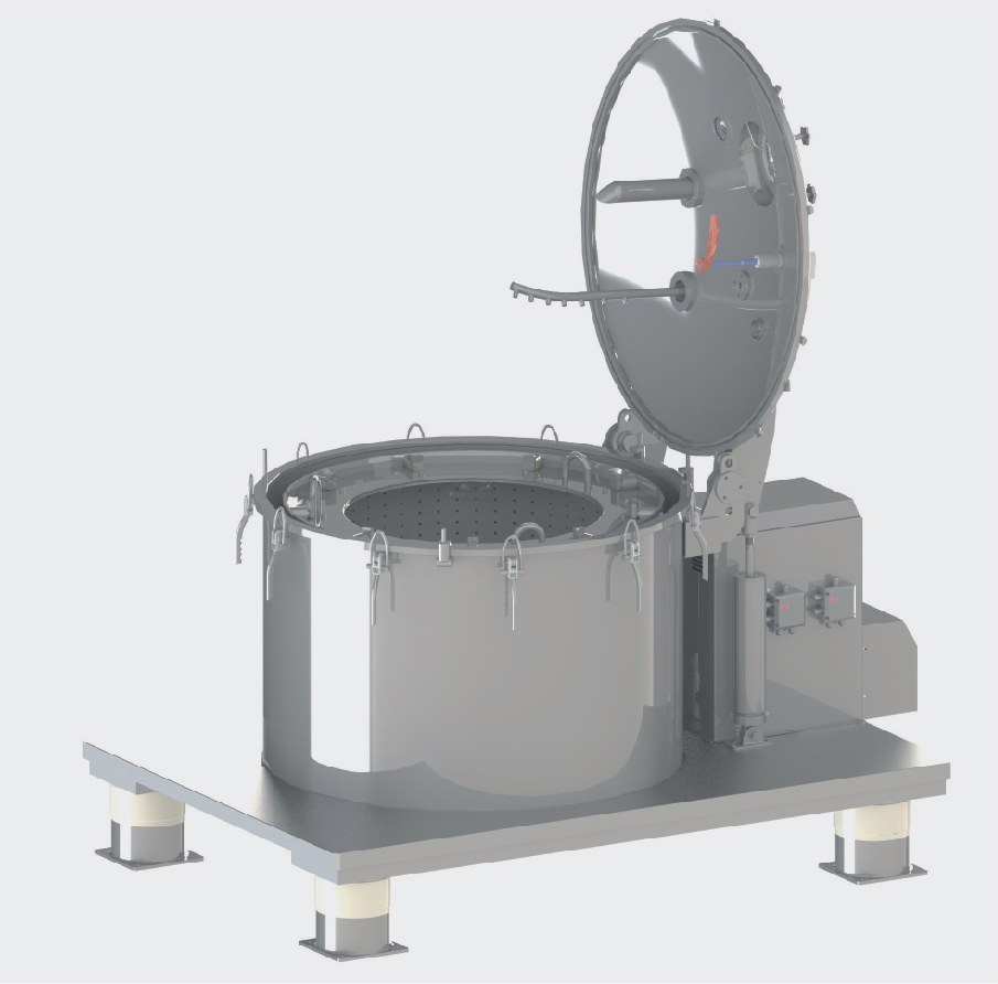液/固混合流體通過進料管分布于離心機轉(zhuǎn)鼓內(nèi),在離心力場作用下,通過濾片截留固相,濾出液相。持續(xù)進料,直至料滿,停止進料,如工藝需要時則對濾餅進行洗滌、提純,同時將洗滌液濾出。進一步脫液,直至達到分離要求。停機,開蓋,人工或吊袋將濾餅卸出,完成一次工作循環(huán)。