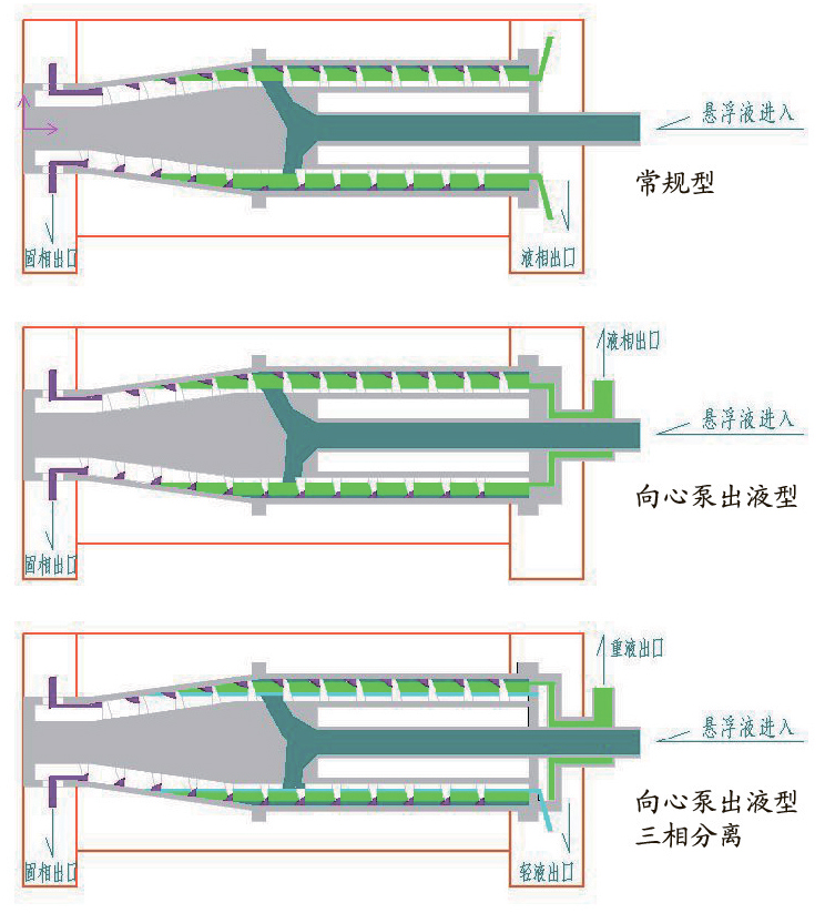 懸浮液通過(guò)進(jìn)料管進(jìn)入轉(zhuǎn)鼓內(nèi),在離心力場(chǎng)作用下密度較大的固相沉降至轉(zhuǎn)鼓壁上,固相在螺旋的推動(dòng)下從沉降區(qū)至干燥區(qū)后從出渣口排出;澄清的液相從轉(zhuǎn)鼓大端溢流口溢出,實(shí)現(xiàn)固液分離。